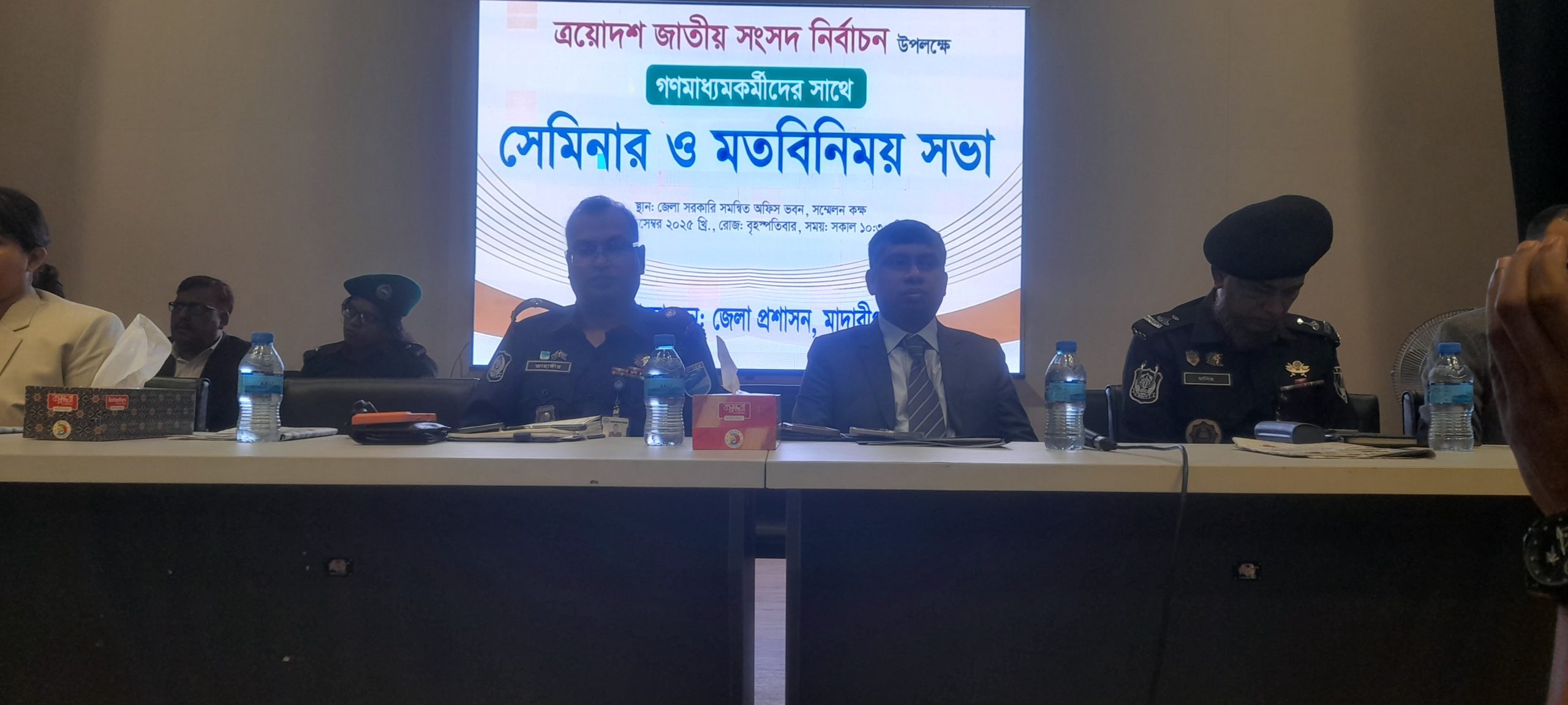 নির্বাচনকে ঘিরে মাঠপর্যায়ে গণমাধ্যমের ভূমিকা আরও শক্তিশালী ও বাস্তবভিত্তিক করতে এই সেমিনার বিশেষ গুরুত্ব বহন করে।সভায় জেলা প্রশাসক জনাব জাহাঙ্গীর আলম সাংবাদিকদের উদ্দেশে বলেন, “আমি সিরাজগঞ্জের ছেলে বলে পরিচয় দিতে চাই না; বরং মাদারীপুরের সন্তান হিসেবে এই জেলার মানুষের সঙ্গে থেকে কাজ করতে চাই। নির্বাচনের মতো একটি গুরুত্বপূর্ণ জাতীয় দায়িত্ব পালনে আপনাদের সহযোগিতা অপরিহার্য।” তিনি গণমাধ্যমকে দায়িত্বশীলভাবে সংবাদ প্রকাশ, গুজব নিরসন, ভোটারদের সচেতন করা এবং সুষ্ঠু পরিবেশ বজায় রাখতে সক্রিয় ভূমিকা পালন করার আহ্বান জানান।