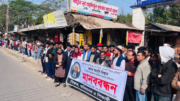 সোমবার (২১ জুলাই) সকাল সা‌ড়ে ১০টায় গাউছ-উর রহমান আইডিয়াল স্কুল ও গাউছ-ফিরোজ ইসলামিকের উদ্যোগে অনুষ্ঠিত মানববন্ধন করা হয়।